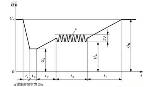 在圖中的t8時間段,其電壓曲線是含有疊加頻率為2Hz交流電壓波形的曲線,利用這曲線,就能更加真實的模擬汽車啟動時直流供電下的帶有紋波的直流電壓對汽車電子設備的性能的影響。